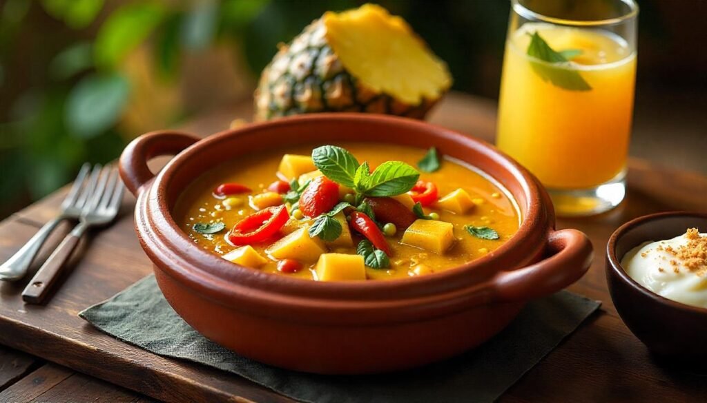 Prepare uma refeição leve, nutritiva e cheia de brasilidade! A Moqueca Vegana com Leite de Coco e Banana-da-Terra é o prato principal — cremoso, aromático e reconfortante. Para harmonizar, um suco natural de abacaxi com hortelã e gengibre traz frescor, ajuda na digestão e realça os sabores. E para finalizar, a sugestão é uma sobremesa suave com toque tropical, como um doce cremoso de pupunha com leite de castanha.